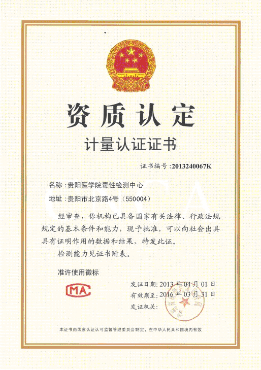 通过贵州省质量技术监督局审查,认定我“中心”具备国家有关法律、行政法规规定的基本条件和能力,可以向社会出具具有证明作用的数据和结果。“中心”于2013年3月31日获新一轮计量认证资质证书(证书编号2013240067K),有效期至2016年3月,检测项目包括农药、化学品、化妆品、生活饮用水、消毒产品5类163项。