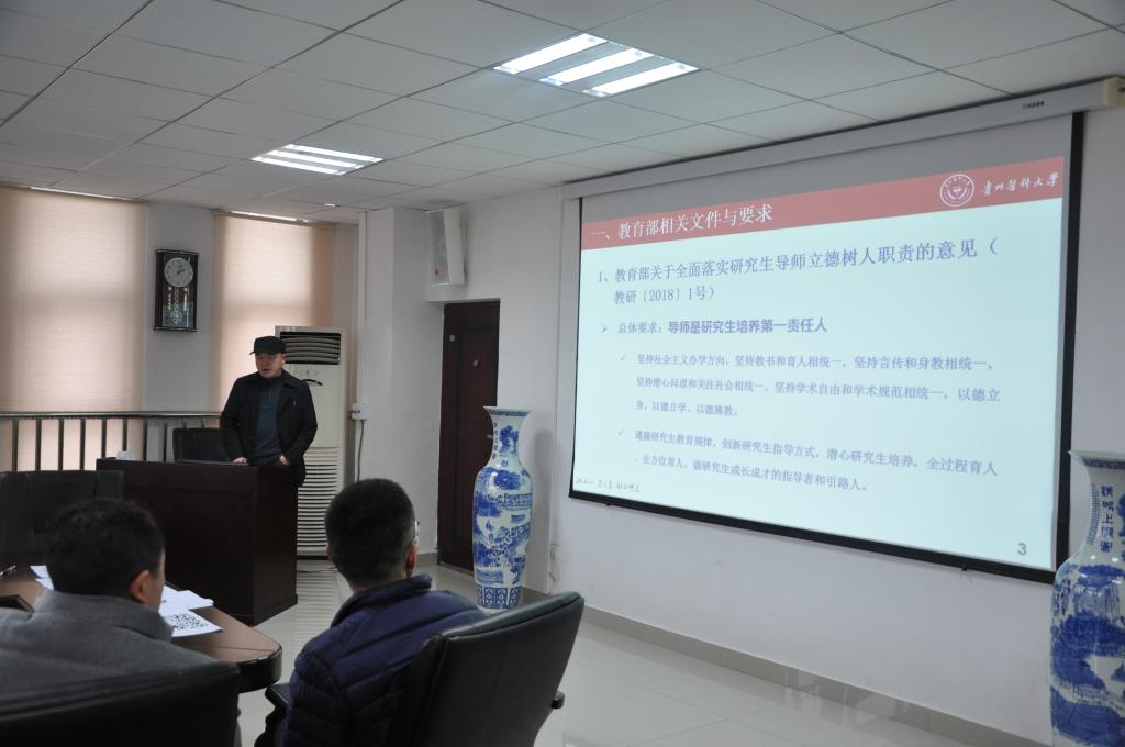 会上,洪峰就《教育部办公厅关于进一步规范和加强公司产品管理的通知》(教研厅〔2019〕1号)、《教育部办公厅关于进一步规范和加强研究生考试招生工作的通知》(教学厅〔2019〕2号)、教育部关于全面落实研究生导师立德树人职责的意见(教研〔2018〕1号)、教育部关于高校教师师德失范行为处理的指导意见(教师〔2018〕17号)以及英国365集团公司全面落实研究生导师立德树人职责实施细则(试行)等文件及要求进行了讲解与解读。他强调,师德师风是一票否决制,无论时代如何变迁,教师的本质并没有变化,教书育人是永恒的,希望各位导师一定要坚定正确政治方向的同时,要自觉加强师德修养,严格遵守师德规范,严以律己,为人师表,坚持以德立身、以德立学、以德施教,以德育德。做研究生成长成才的指导者和引路人。
