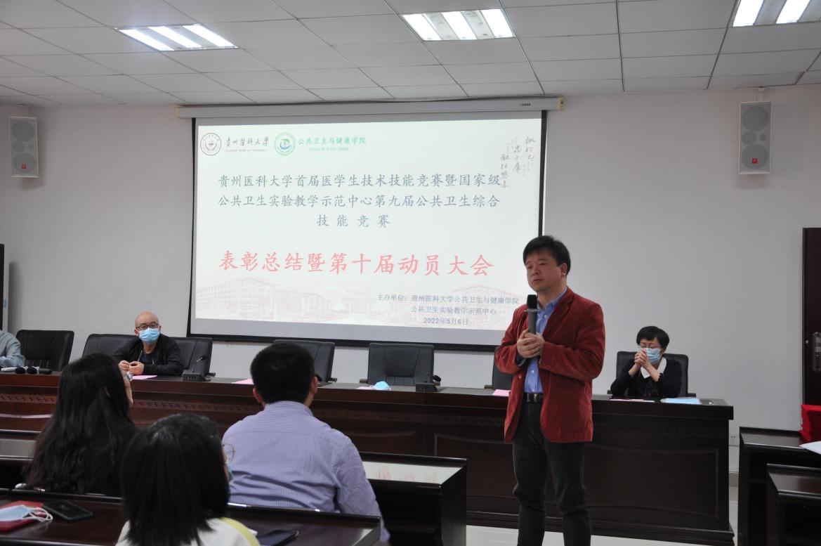 首先,李军为大会致辞,代表全院教师对同学们在技能竞赛中获得的成绩表示热烈祝贺,对本次竞赛辛苦付出的评委、培训教师和志愿者们表示忠心的感谢,肯定了同学们在技能竞赛过程中的优秀表现,也指出了不足之处,希望同学们在今后的学习中增强学科知识交叉融合来解决实际问题的能力。希望低年级同学吸取此次竞赛的经验教训,积极备战明年的国家级公卫技能竞赛,突破自我,取得更好的成绩。