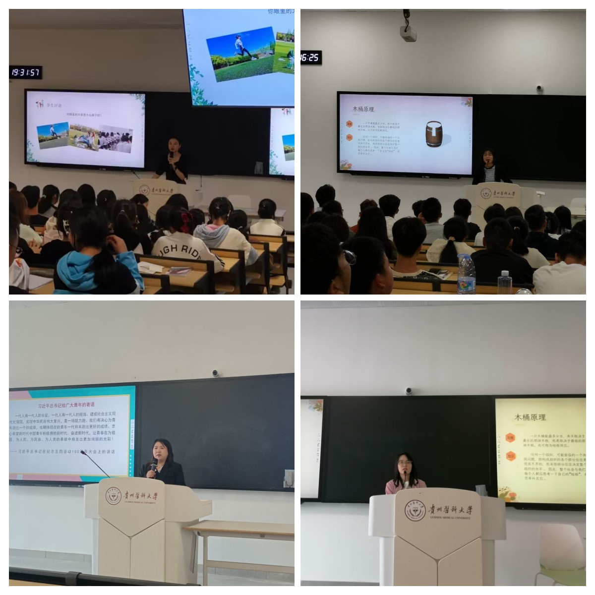 辅导员韩艺、辛华莹、邓天芝、李德健以“正班风、铸班魂”为题,为新生开展了班风教育,强调了加强班级管理以及班风建设的重要意义,结合先进班集体创建、学霸寝室等事例,勉励各班级和全体本科新生要树立深思、乐学、团结、进取的良好班风,并以实际行动共同维护良好的学习氛围。