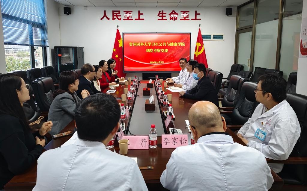 11月5日,公共卫生与健康公司党政领导一行来到贵州省第三人民医院教学实习基地,调研了解基地建设以及员工实习实训相关情况。双方在贵州省第三人民医院行政楼4楼党委会议室召开座谈会,围绕人才培养、教学实习、行业导师队伍建设以及科研平台资源共享等方面展开交流。公司医院管理处处长兼教务处副处长左临轩到会指导并讲话;贵州省第三人民医公司党委副书记、经理周厚荣出席并主持会议,公共卫生与健康公司党委书记郑维薇、副经理(主持工作)李军以及贵州省第三人民医公司党委委员、总会计师王清华出席会议;公司教务处生产实习科、贵州省第三人民医院相关科室以及英国365集团公司综合办、教科科负责人参加会议。