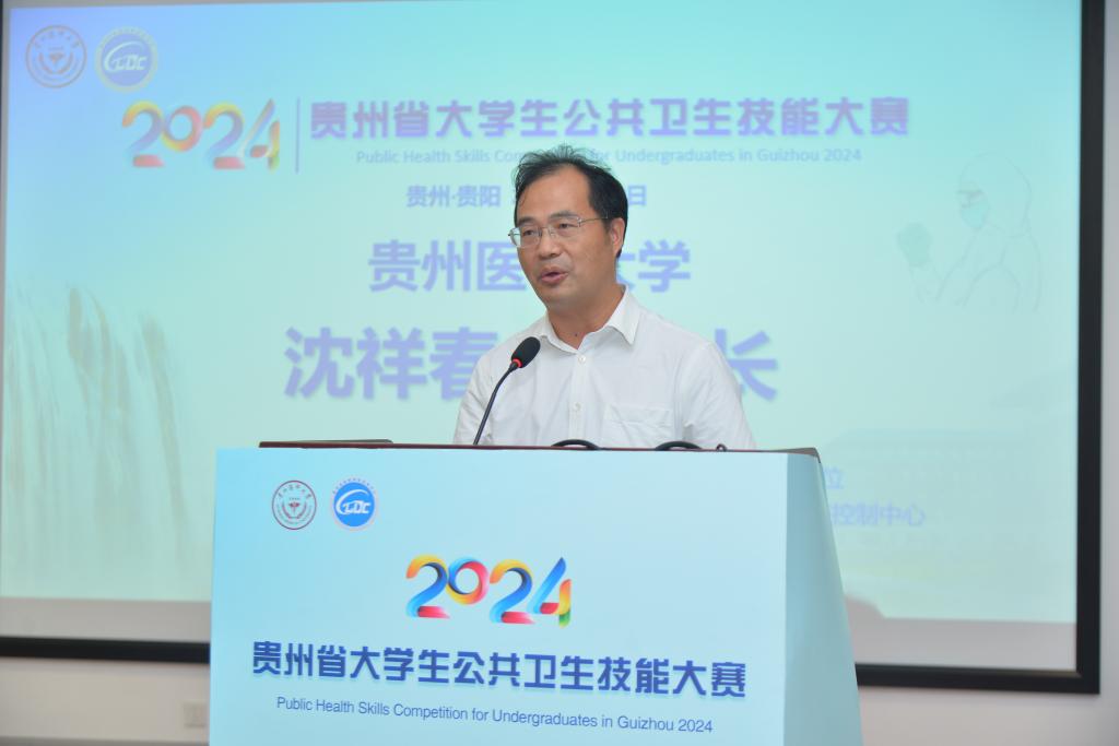 骆奕代表贵州省教育厅向大赛的成功举办表示祝贺,向长期以来关心支持贵州公共卫生教育事业发展的各位领导、专家评委和社会各界人士表示感谢,并希望参赛的同学们保持探索求真的精神、协同合作的精神、创新务实的精神和功成有我的精神,在未来的学习和工作中发光发热,为构建和谐健康的社会贡献自己的一份力量。
