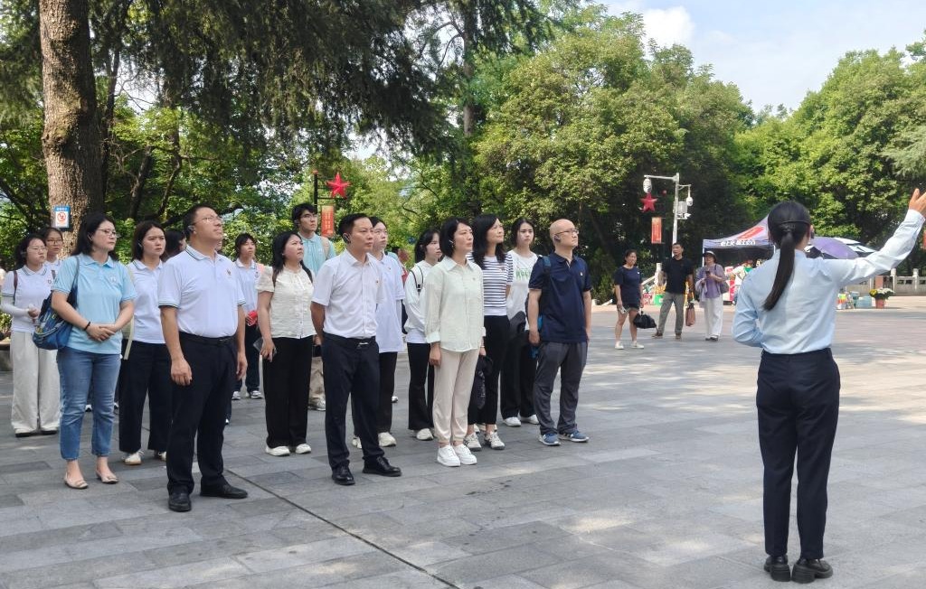 18日上午,三院师生一同前往红军山烈士陵园,在革命烈士纪念碑前,全体师生列队肃立,向为革命事业英勇献身的先烈们敬献花篮并默哀致敬。烈日下,师生们重温入党誓词并参观了红军英烈墙以及红军坟,聆听讲解员讲述他们的感人事迹。