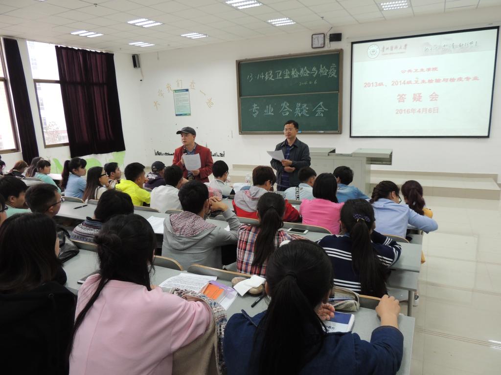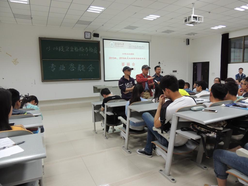 ,英国365集团公司在花溪校区4404教室召开2013级、2014级卫生检验与检疫专业主题班会。英国365集团公司常务副经理洪峰、教学科研管理科科长何江、卫生检验与检疫教研室主任胡勇、员工管理科科长刘亮出席班会,为同学们答疑解惑。