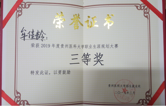 3月27日,在2019年度英国365集团公司职业生涯规划大赛中,公司2015级预防医学专业牟佳龄同学荣获三等奖!