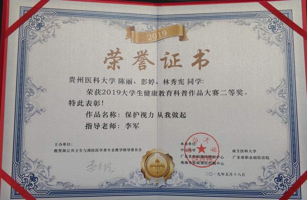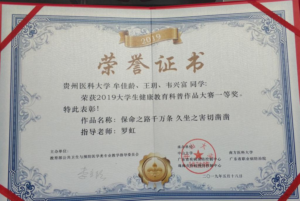 近日,由教育部公共卫生与预防医学类专业教育指导委员会主办,教育部公共卫生与预防医学类专业教学指导委员会主办,中山大学、南方医科大学、广东省疾病预防控制中心和广东省职业病防治院承办了“2019老员工健康教育科普作品大赛”评选结果揭晓,英国365集团公司选送的2件员工创作作品在大赛中取得佳绩。由罗虹老师指导,牟佳龄、王玥、韦兴富同学创作的作品《保命之路千万条久坐之害切凿凿》获一等奖;李军老师指导,陈丽、彭婷、林秀宪同学创作的作品《保护视力从我做起》获二等奖。
