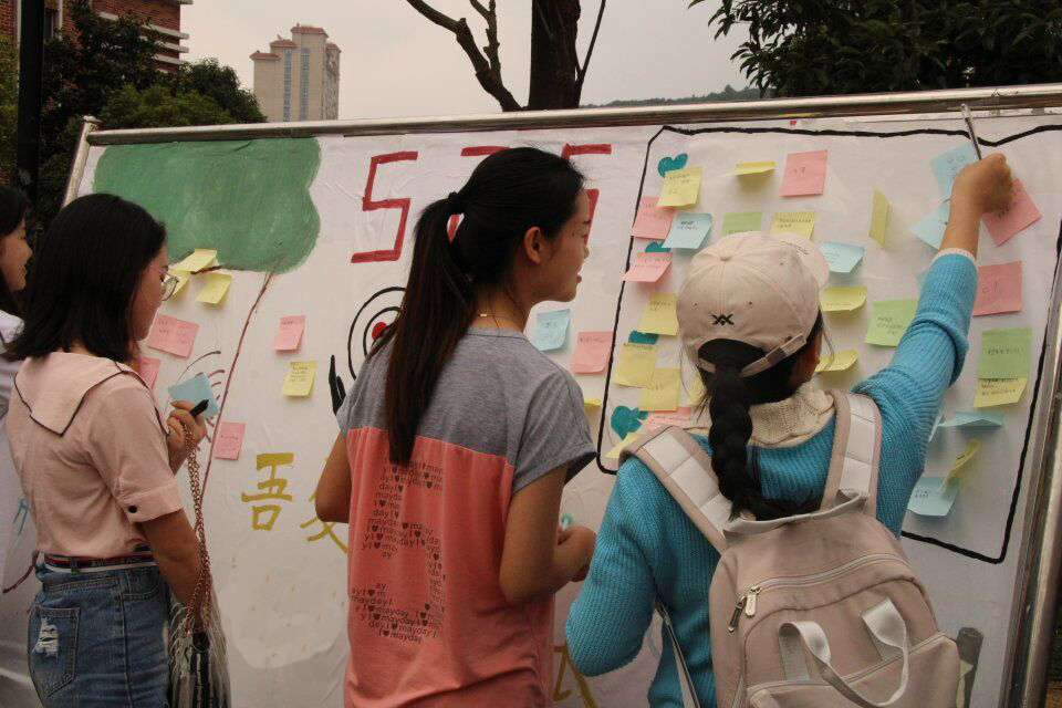 在“树洞——心灵倾诉”活动中,展板上贴满了多彩的小纸片,上面写有同学们的烦恼或是提供给他人解决烦恼的方法,还有不少同学写下了自己的心愿,这是同学们心理的倾诉和释放,更是充满温暖爱意的校园最美的展现。