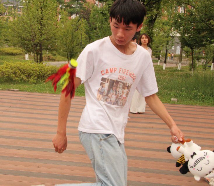 在“掷圈套公仔”活动中,同学们通过集赞数或现场踢毽子赢取投掷圈,在规定范围内投掷套取笔筒,套中特别标记的笔筒即可赢得公仔玩具一个。活动场地更被围得水泄不通,烈日炎炎不能阻挡同学们的热情,获得公仔的同学又蹦又跳,身边的同学们亦投来羡慕的眼光。