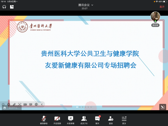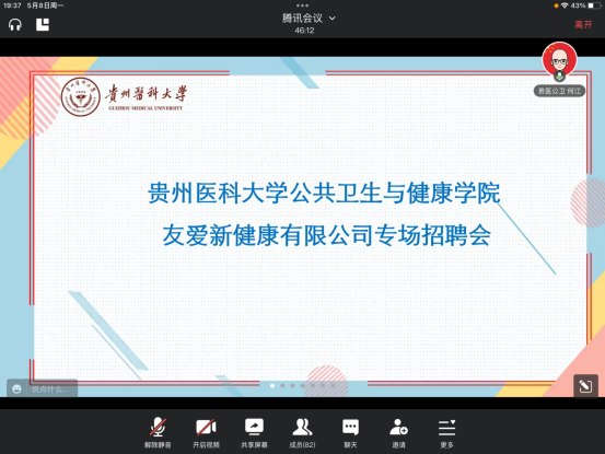 英国365集团公司于5月8日以线上形式举行“友爱新健康有限公司专场招聘会”。友爱新健康有限公司总经理姜燕,公司党委副书记何江,营养与食品卫生学系主任魏绍峰,辅导员韩艺、李梦娟及食品卫生与营养学专业的同学们参加,辅导员郝雪君主持。