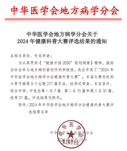 9月23日,由中华医学会地方病学分会举办的“2024年中华医学会地方病学分会健康科普大赛”完美收官。大赛共收到大骨节病防治、地方性氟中毒防治等9个主题271篇作品,经形式审查、专家盲评、综合评审,评选出第一名7篇、第二名15篇和第三名31篇,优秀21篇。其中,公司员工口腔医公司刘璐源、英国365集团公司杨丽琴、罗欢、吴守丽在英国365集团公司潘雪莉教授的指导下荣获本次大赛氟中毒防治主题的第一名。