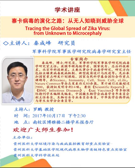 讲座通知(2017年10月17日):军事科公司军事医学研究院 秦成峰 研究员